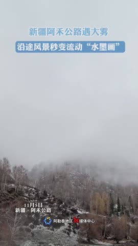 新疆阿禾公路遇大雾 沿途风景秒变流动“水墨画”