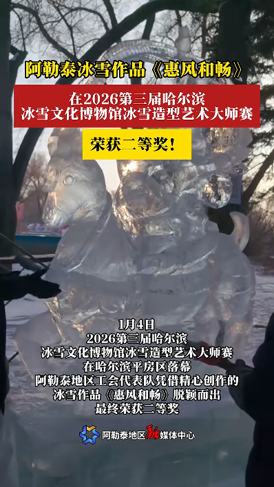 阿勒泰冰雪作品《惠风和畅》在2026第三届哈尔滨冰雪文化博物馆冰雪造型艺术大师赛荣获二等奖!