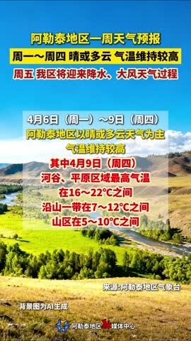 阿勒泰地区一周天气预报 周一~周四 晴或多云 气温维持较高 周五 我区将迎来降水、大风天气过程