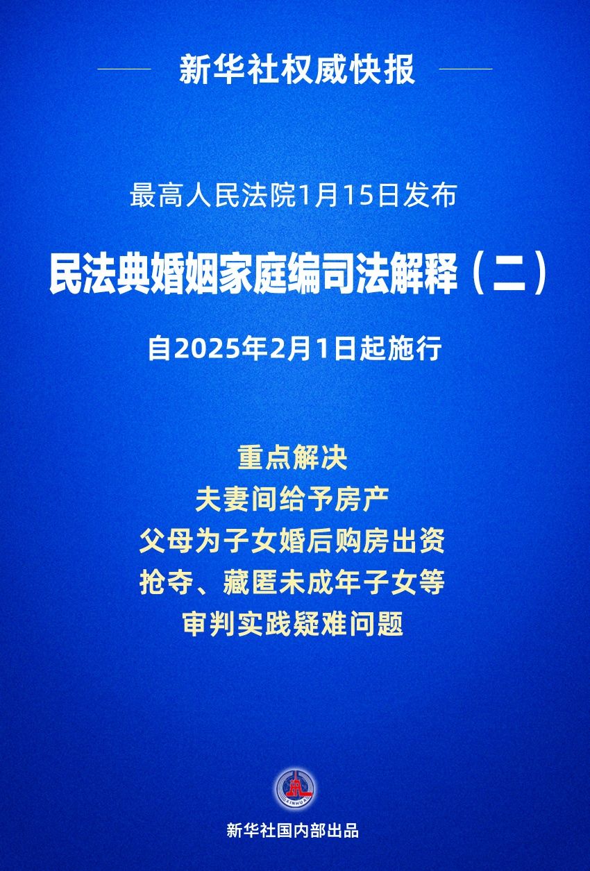 《最高人民法院关于适用〈中华人民共和国民法典〉婚姻家庭编的解释(二)》1月15日对外发布,自2025年2月1日起施行。