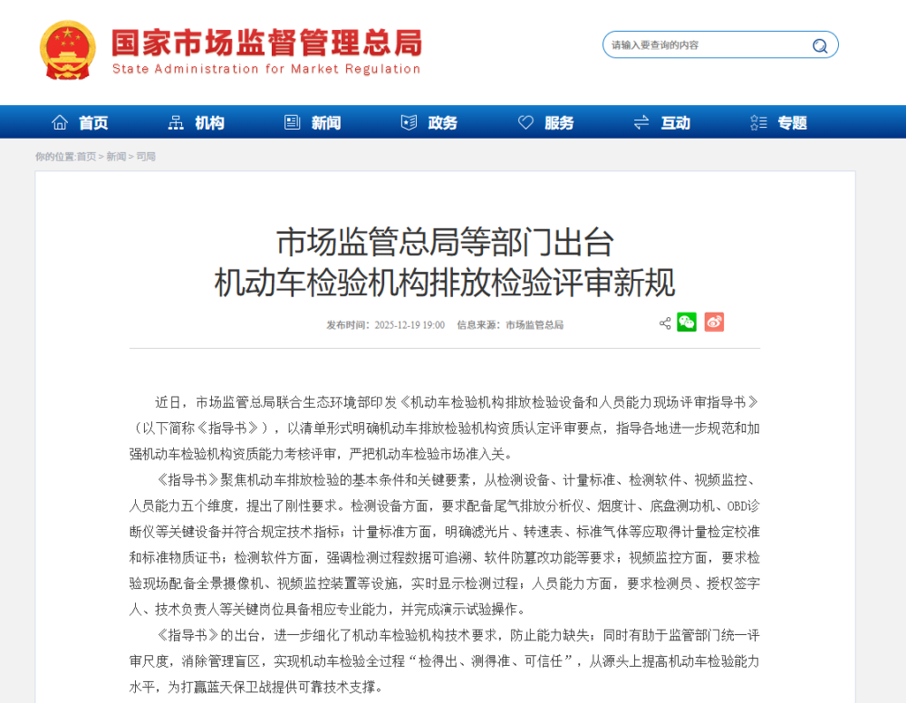 市场监管总局等部门出台机动车检验机构排放检验评审新规