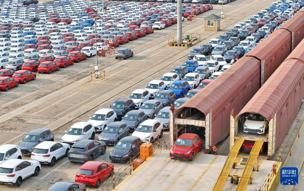 1月14日,在山东港口烟台港,国产汽车从商品车班列中驶出到码头集结等待装船出口(无人机照片)。新华社发(唐克 摄)