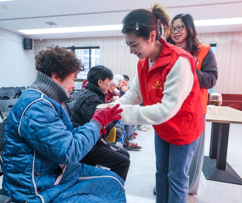 在浙江省湖州市吴兴区龙泉街道市陌河社区幸福邻里活动中心,志愿者为老年人送上祛风散寒的中药茶饮。新华社记者 徐昱 摄