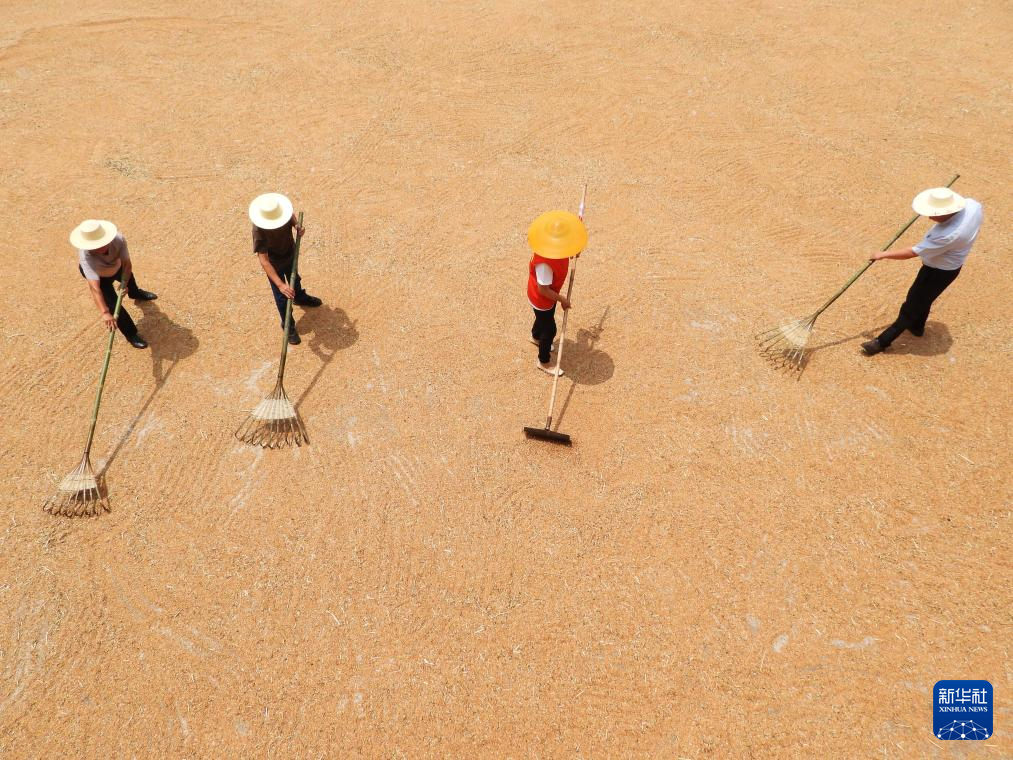 5月16日,在四川省达州市渠县文崇镇学堂村,种粮大户在晾晒刚收获的小麦。新华社发(邓良奎摄)