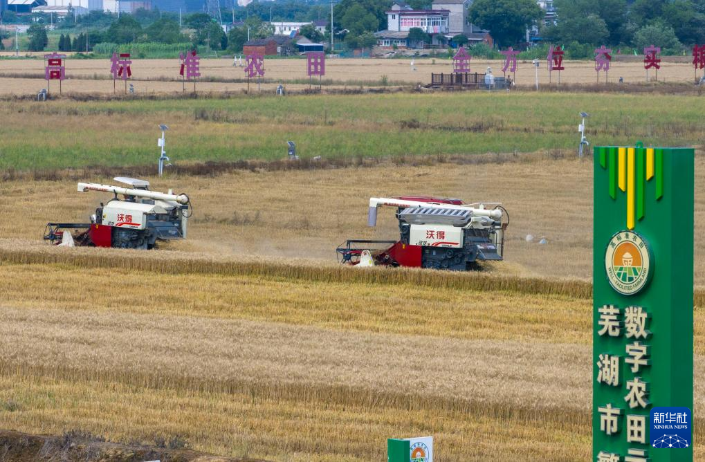 5月17日,在安徽省芜湖市繁昌区新港镇新东村数字农田里,农机手驾驶农机收割小麦(无人机照片)。新华社发(肖本祥摄)