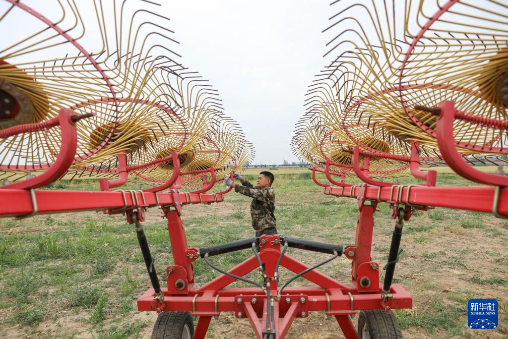 5月13日,农机技术人员在河南省平顶山市宝丰县闹店镇检修搂草机,为麦收做准备。新华社发(何五昌摄)