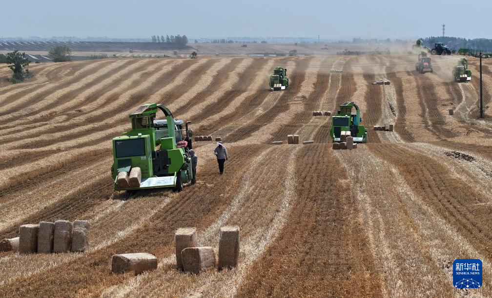 5月16日,湖北省襄阳市襄州区古驿镇,农机手驾驶农机在田间回收小麦秸秆。新华社发(安富斌摄)