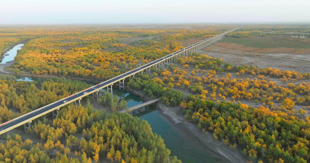 该桥横跨叶尔羌河,穿越原始胡杨林自然保护区。为最大限度保护生态环境、减少树木砍伐与植被破坏,采用高架设计形成“飞跃胡杨林”的“生态桥”。