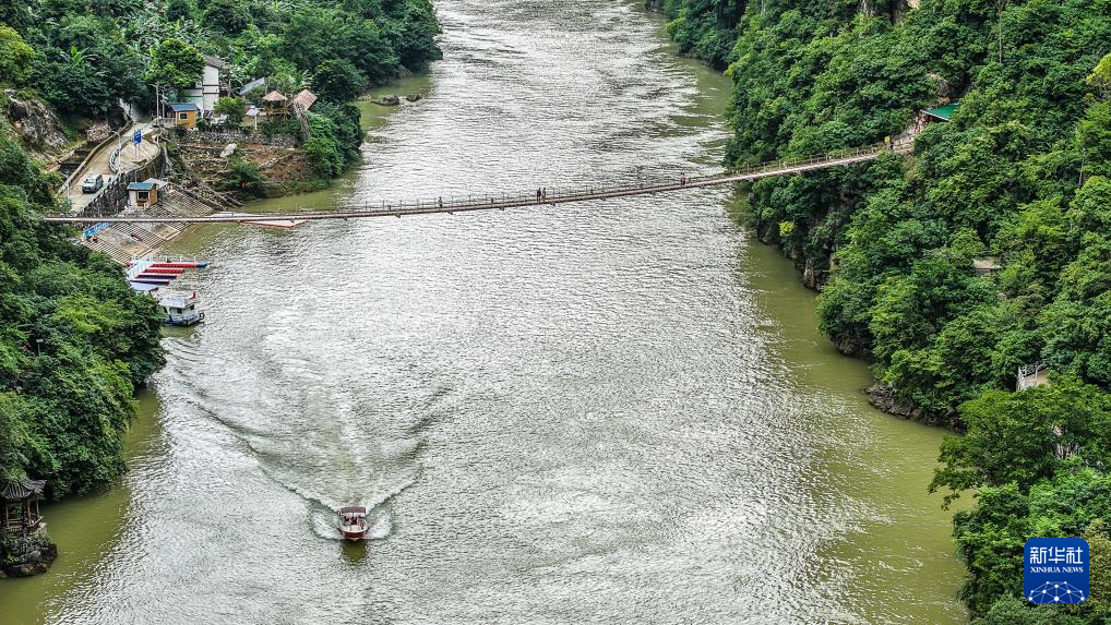 景区内的索道桥与远处的花江峡谷大桥遥相呼应(9月27日摄,无人机照片)。