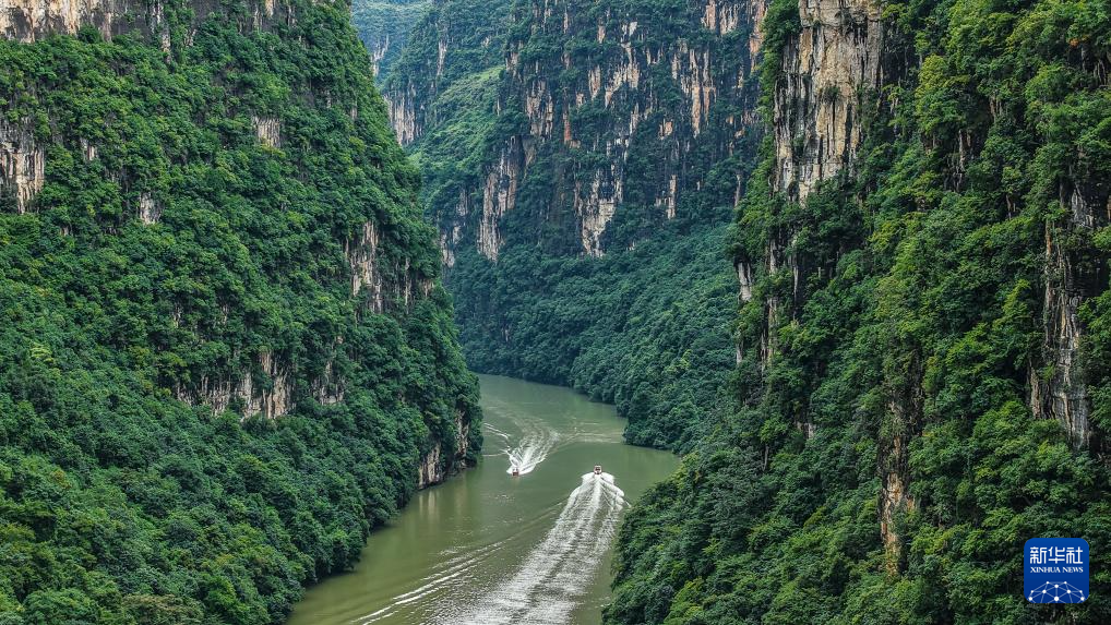 游客乘船游览花江大峡谷景区(9月27日摄,无人机照片)。