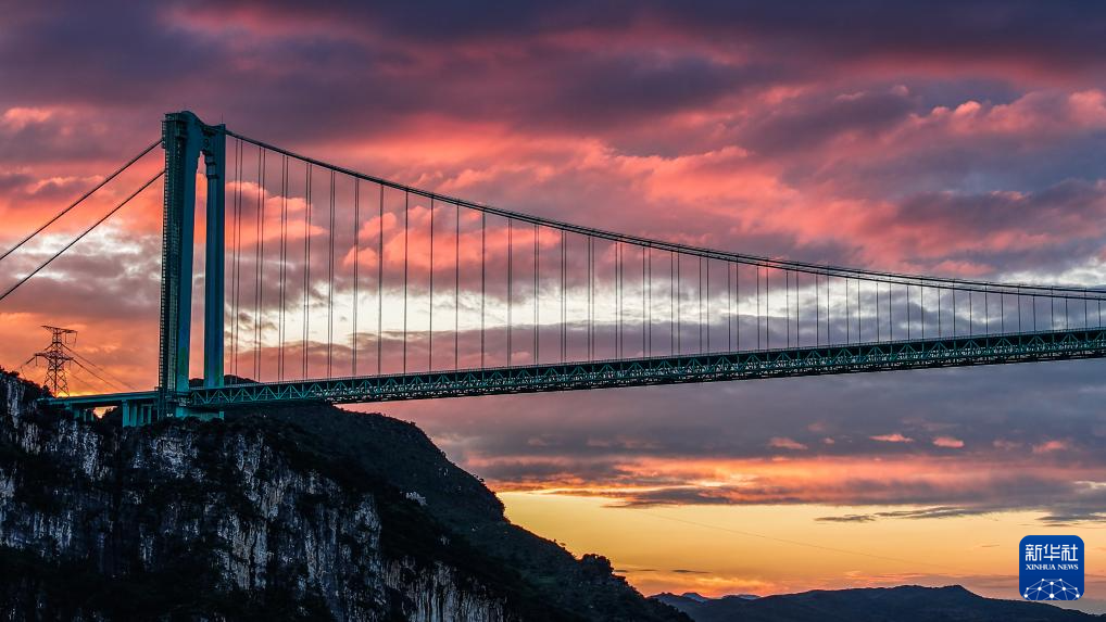 晚霞中的贵州花江峡谷大桥(9月27日摄,无人机照片)。新华社记者 陶亮 摄