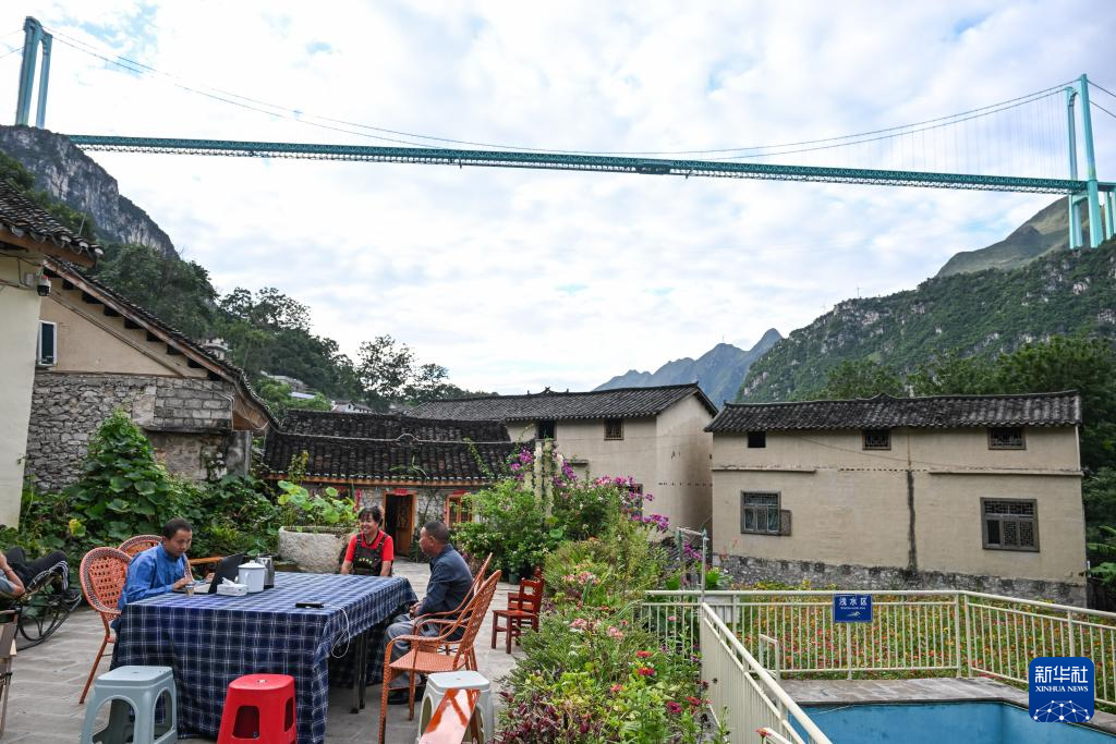 9月27日,在贵州省贞丰县平街乡花江村,返乡创业村民林国权(蓝衣者)在“布依桥缘居”民宿里与入住的客人聊天(无人机照片)。新华社记者 杨文斌 摄