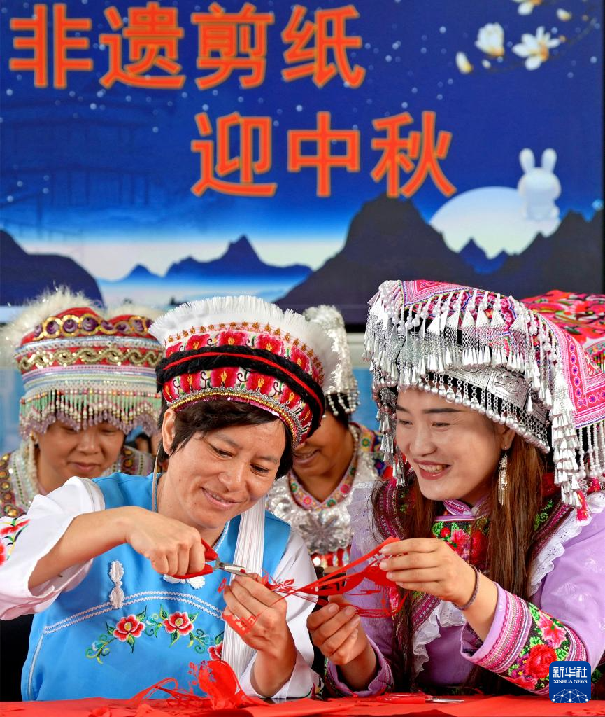 9月30日,江苏省海安市墩头镇宝祥村少数民族职工在学剪中秋节主题剪纸作品。新华社发(周强摄)