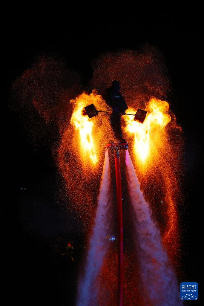 9月29日晚,在重庆市黔江区武陵水岸,民间艺人在水上表演非遗火壶。新华社发(杨敏摄)