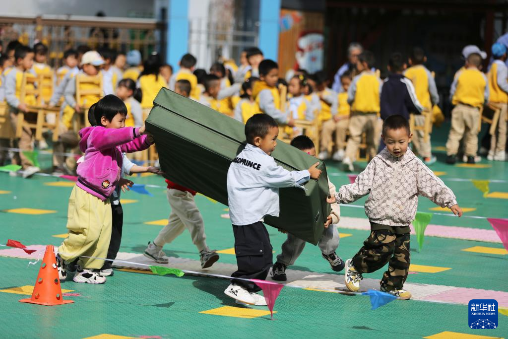 9月29日,甘肃省定西市安定区友谊幼儿园的小朋友在玩接力游戏。新华社发(王克贤摄)