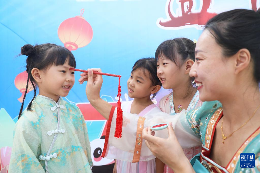 9月29日,在河北省唐山市丰润区新城道幼儿园举行的“花好月圆 古韵迎中秋”主题活动中,老师为小朋友点朱砂。新华社发(朱大勇摄)