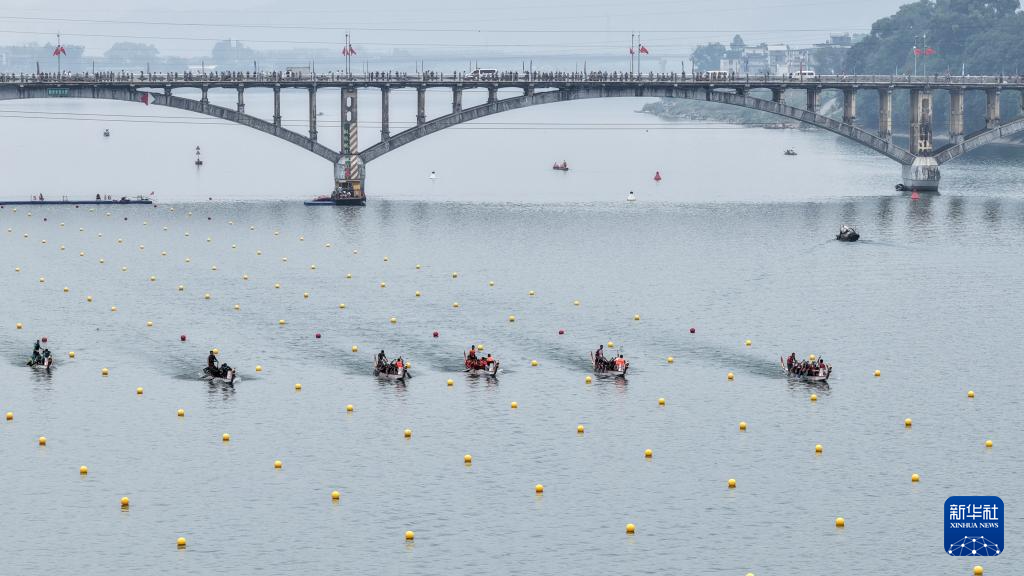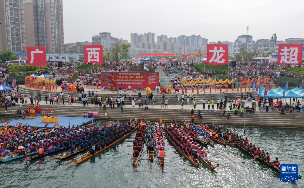 9月30日,在广西柳州市融安县迎国庆龙舟大赛中,参赛队伍在比赛中(无人机照片)。新华社记者 黄孝邦 摄