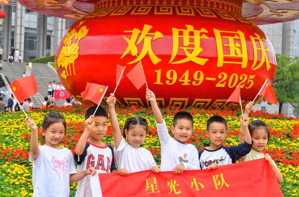 10月1日,小朋友在安徽省合肥市蜀山区市民广场国庆主题花篮前拍照。新华社发(陈三虎摄)