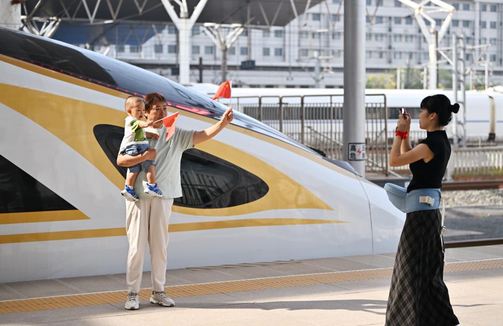 10月1日,旅客在天津站城际列车旁留影。新华社记者 李然 摄