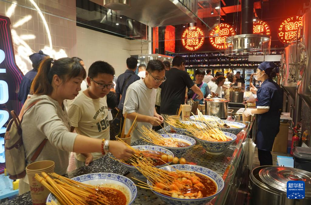 10月3日,游客在河北省唐山市唐山宴美食街品尝小吃。新华社发(梁志强摄)