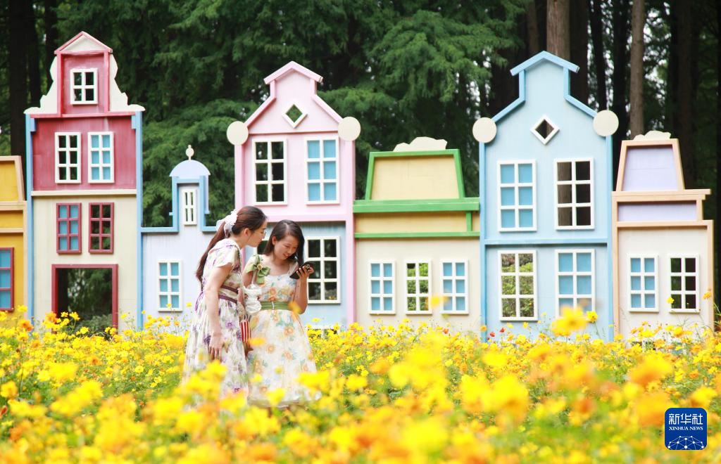 10月5日,人们在南京中山植物园盛开的黄秋英花丛中赏花游玩。新华社发(刘建华摄)