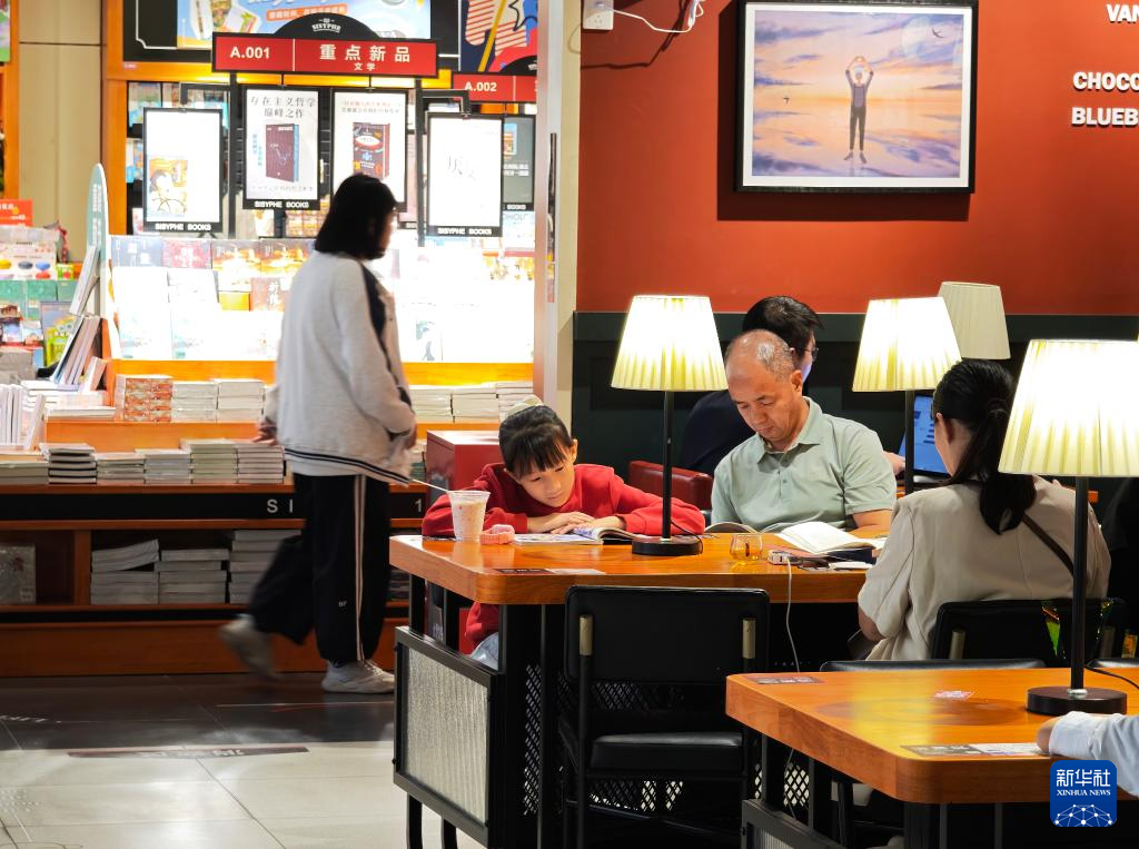 10月5日,家长带着孩子在天津市西青区中北镇一家书店内阅读。新华社记者 李然 摄