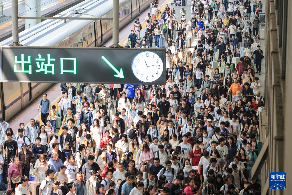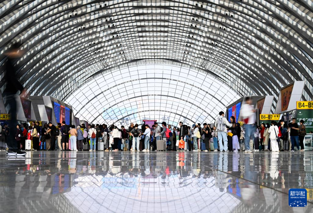 10月7日,旅客在南京火车站有序出站。新华社发(苏阳 摄)