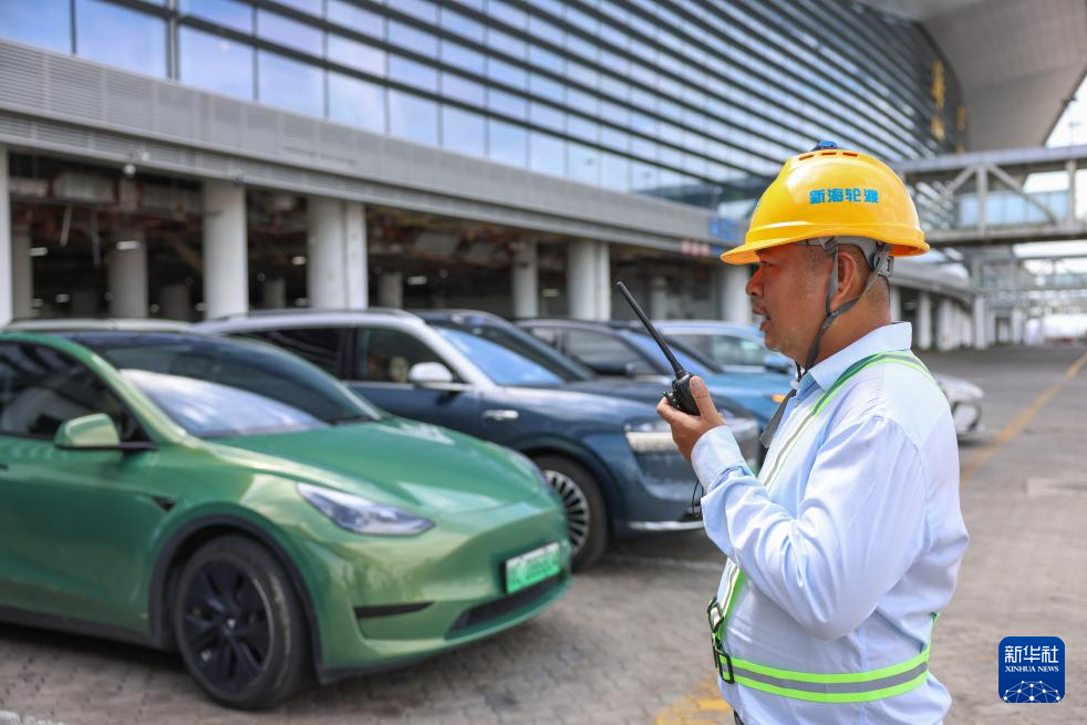 10月7日,海南省海口市新海港的工作人员指挥汽车有序驶入客滚船。新华社记者 张丽芸 摄