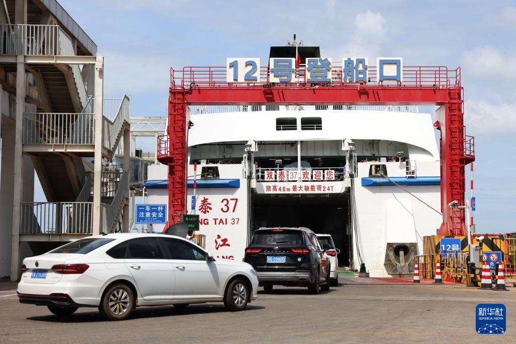 10月7日,在海南省海口市新海港,车辆有序驶入客滚船。新华社记者 张丽芸 摄