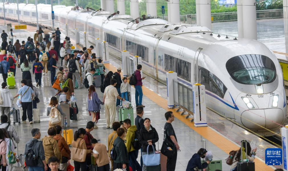 10月7日,旅客在河南洛阳龙门站乘车。新华社发(张怡熙 摄)