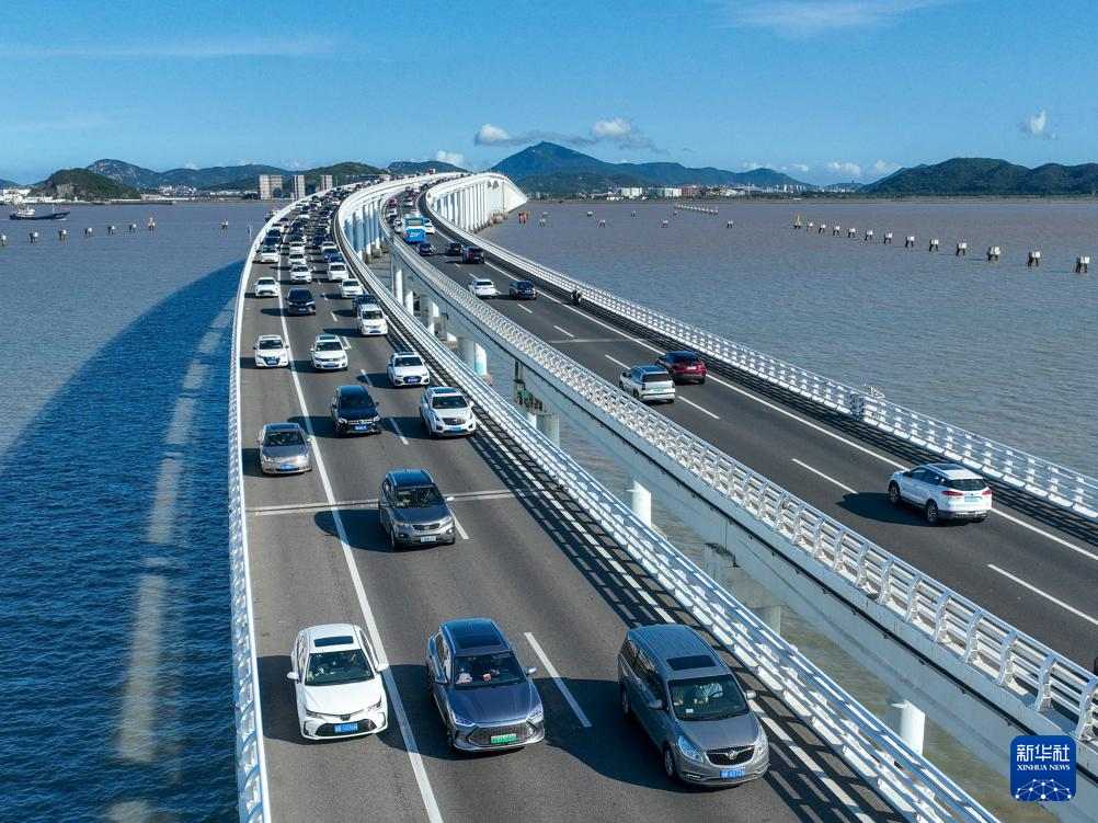 10月7日,在浙江省舟山市普陀区,返程车辆行驶在朱家尖海峡大桥上(无人机照片)。新华社发(邹训永 摄)