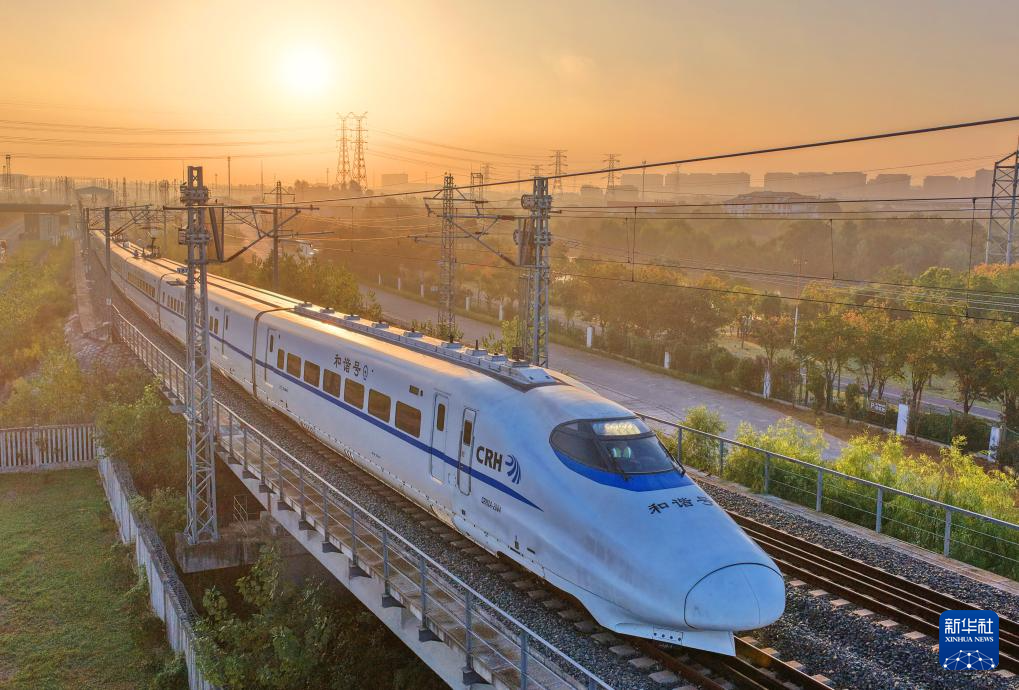 10月10日在江苏南京拍摄的行驶中的动车组列车(无人机照片)。新华社发(苏阳摄)