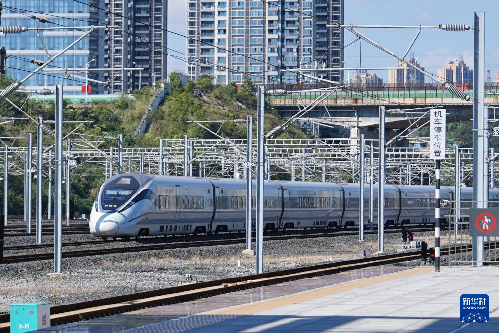 10月10日,一辆列车驶离贵阳北站。新华社发(张维摄)