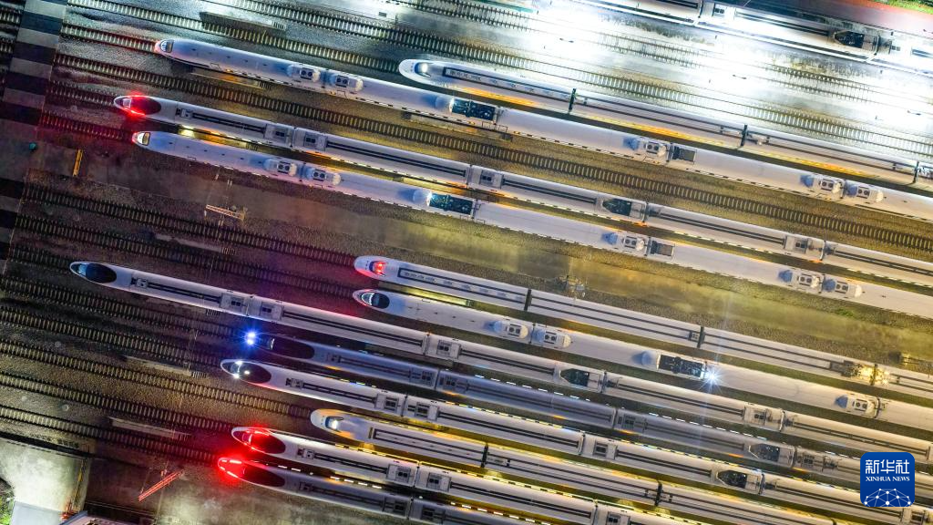 10月10日拍摄的停靠在南京动车段南京南动车运用所存车线上的列车(无人机照片)。新华社发(杨素平摄)