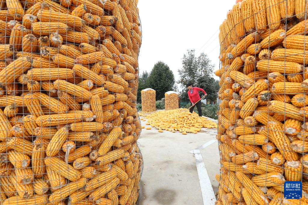 10月11日,云南省文山壮族苗族自治州广南县莲城镇那朵村的农民在晾晒收获的玉米。新华社发(熊平祥摄)