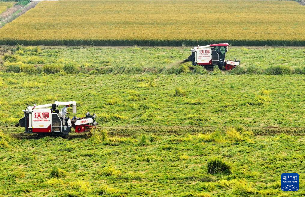 10月11日,湖南省常宁市洋泉镇农民驾驶收割机在收获水稻(无人机照片)。新华社发(周秀鱼春摄)