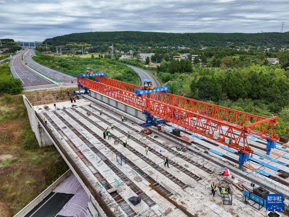 10月12日,在京昆高速广元至绵阳段扩容工程牛头河大桥,工人在进行架梁作业。新华社记者 王曦 摄