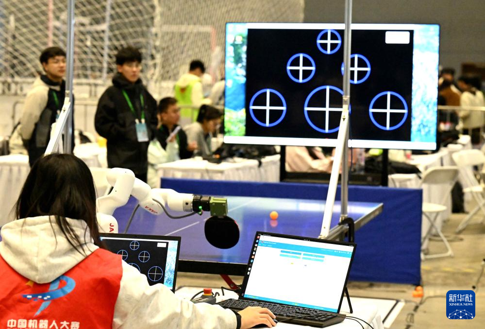 10月17日,乒乓球机器人在河北省石家庄国际会展中心进行比赛。新华社发(陈其保摄)