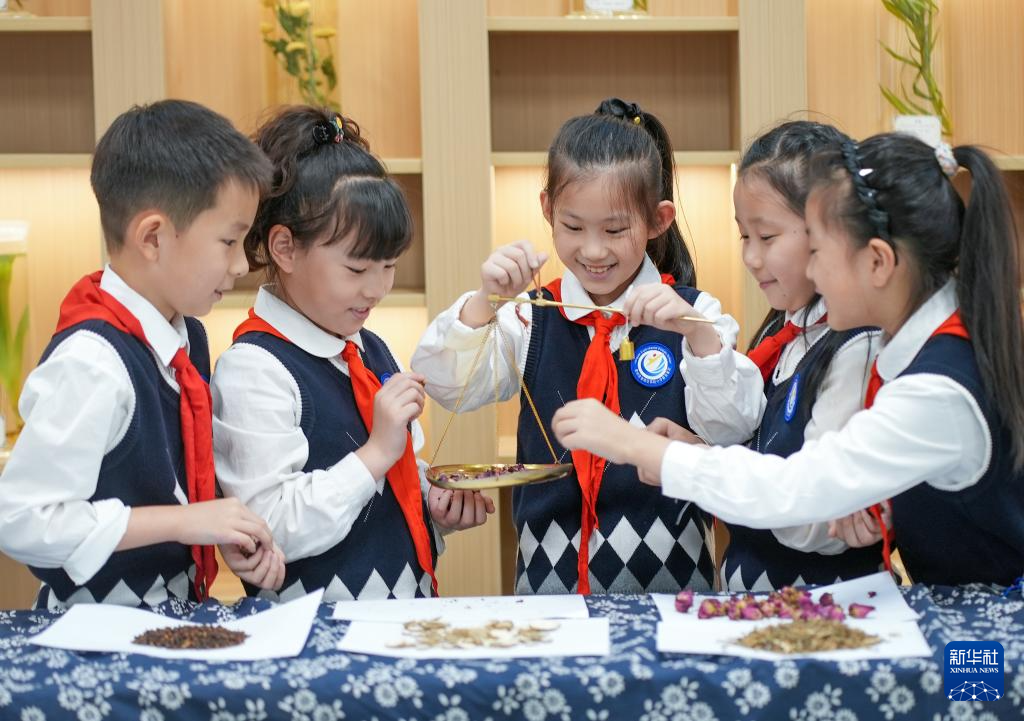 10月22日,在江苏省泰州市姜堰区实验小学教育集团北街北校区,学生体验称量中草药。新华社发(周社根 摄)