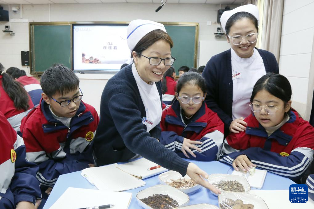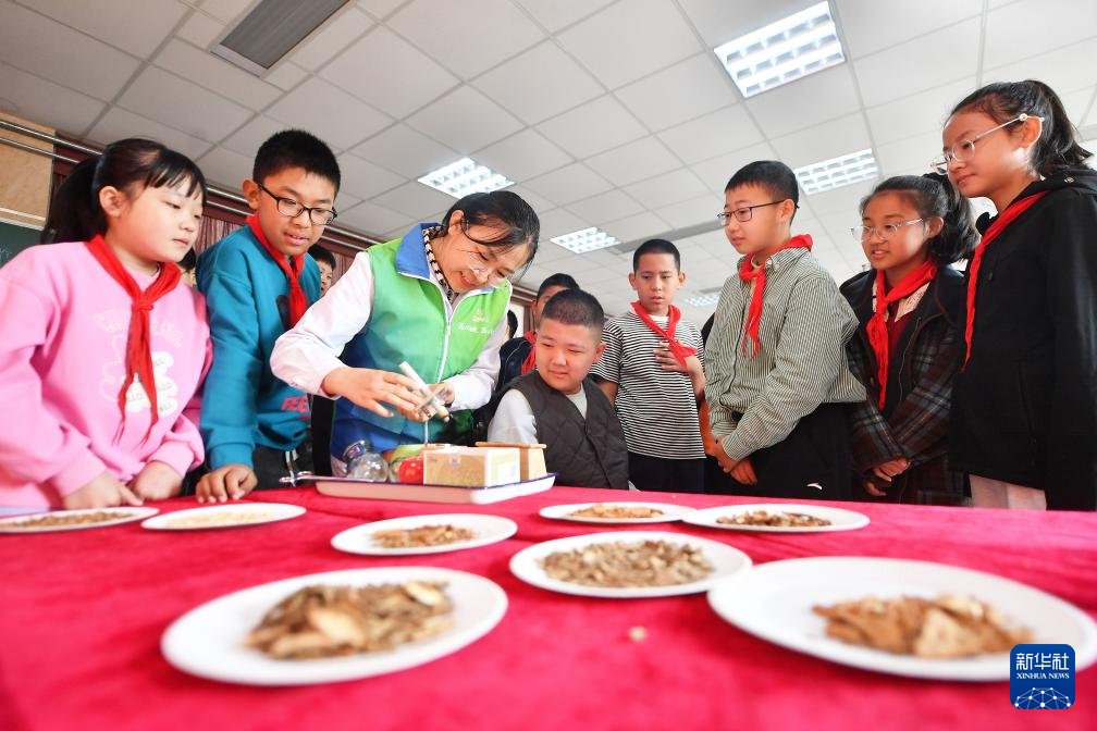 10月22日,在河南省洛阳市汝阳县城关镇第三初级中学,县中医院医务人员给同学们讲解中药种类和功能。新华社发(康红军 摄)