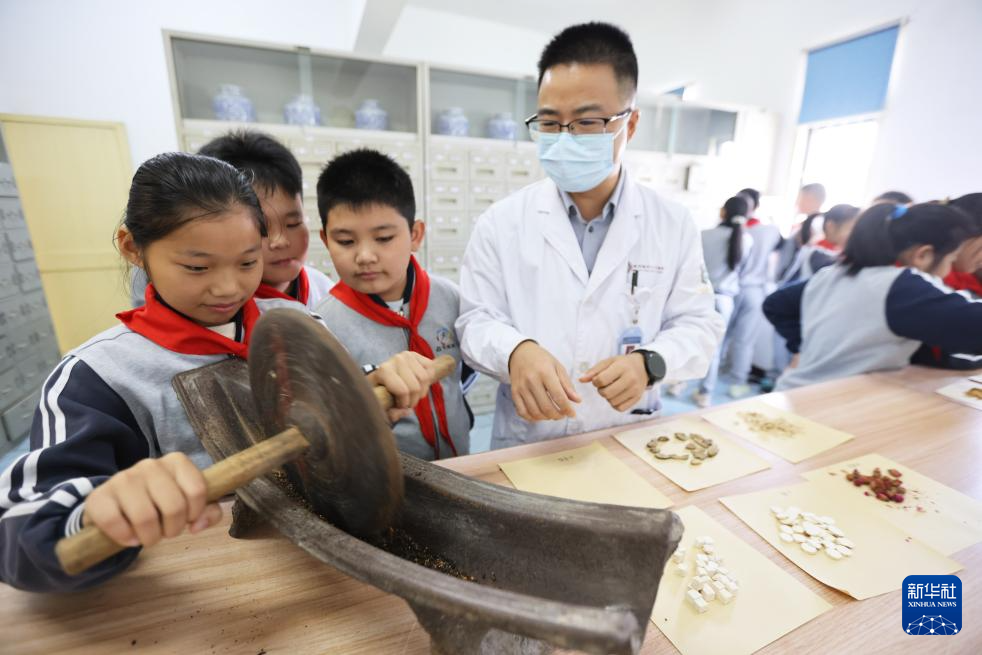 10月22日,在浙江省湖州市德清县乾元镇中心卫生院,镇中心小学学生体验用“铁药碾”碾磨中药。新华社发(倪立芳 摄)
