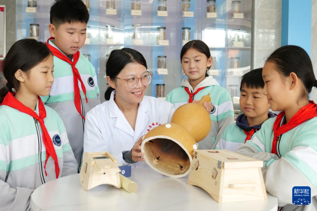 10月21日,在山东省聊城市茌平区成无己纪念馆,老师在给小学生们讲解中医知识。新华社发(赵玉国 摄)