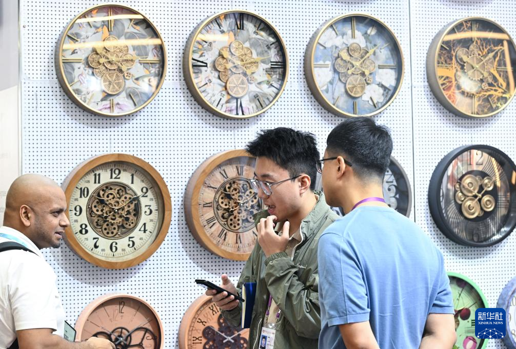 10月23日,境外采购商在钟表展台洽谈。新华社记者 邓华 摄