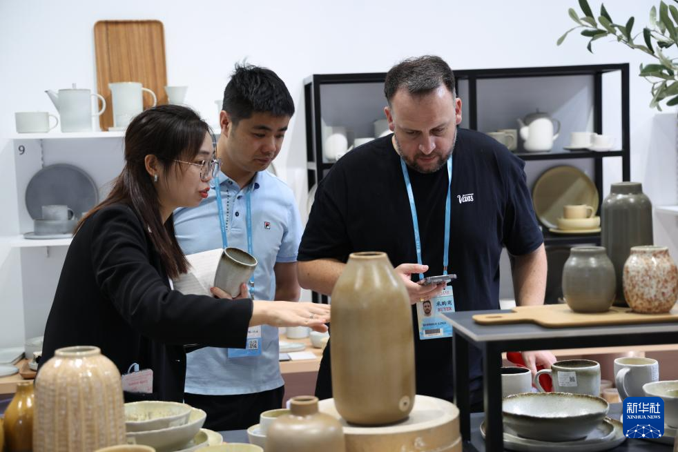 10月23日,境外采购商在日用瓷器企业展台洽谈。新华社记者 邓华 摄