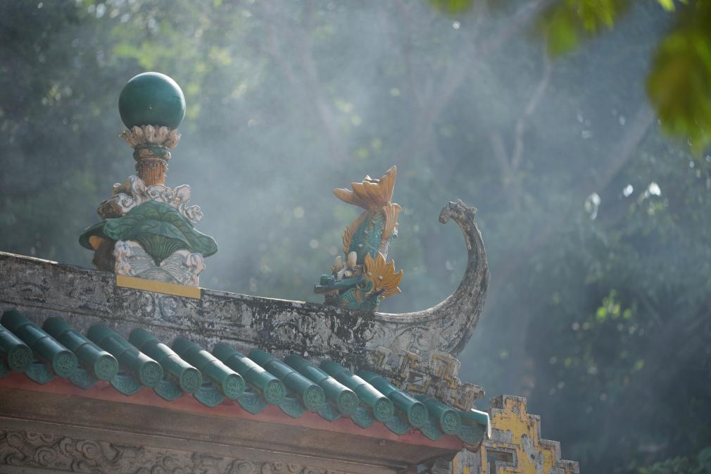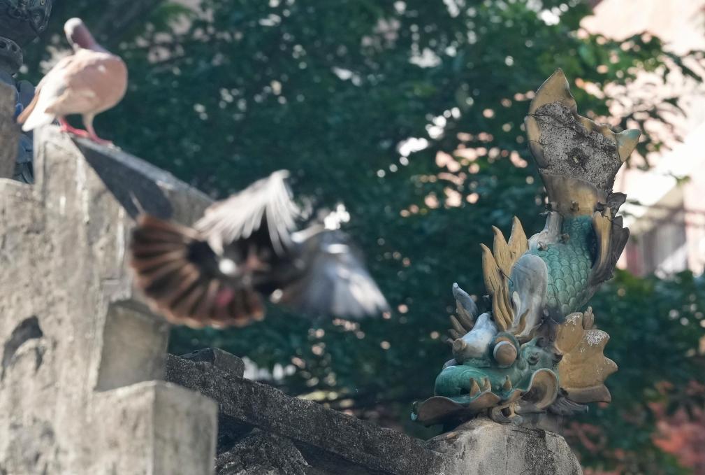 11月12日,在香港的文武庙屋顶上,立着鳌鱼的雕塑。新华社记者 吴鲁 摄