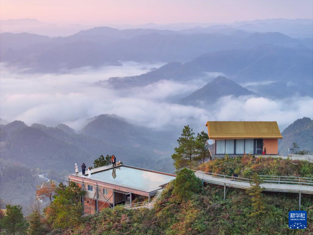11月15日,游人在贵州省开阳县高寨苗族布依族乡牌坊村欣赏晨景(无人机照片)。新华社发(袁福洪摄)