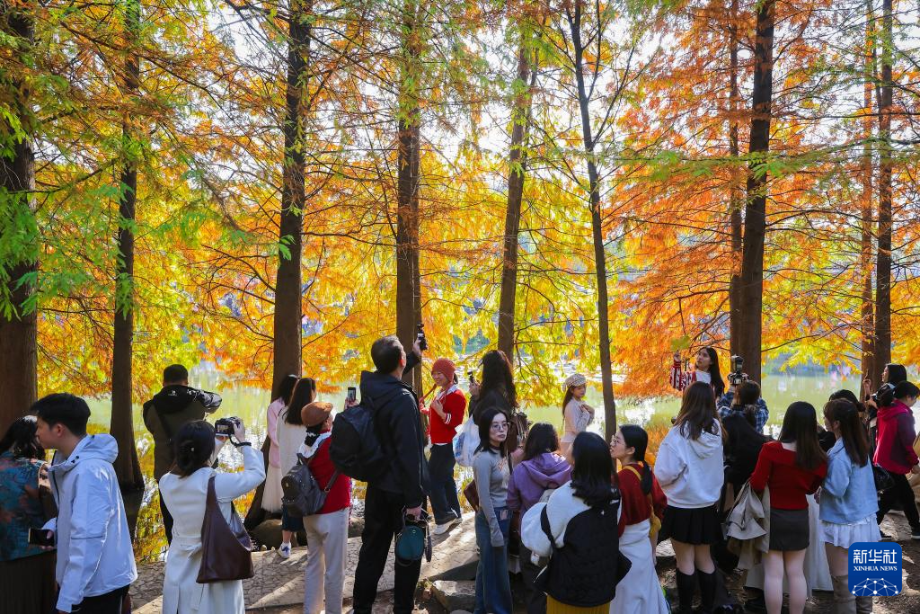 11月16日,游客在江苏南京明孝陵景区燕雀湖畔赏景游玩。新华社发(苏阳摄)