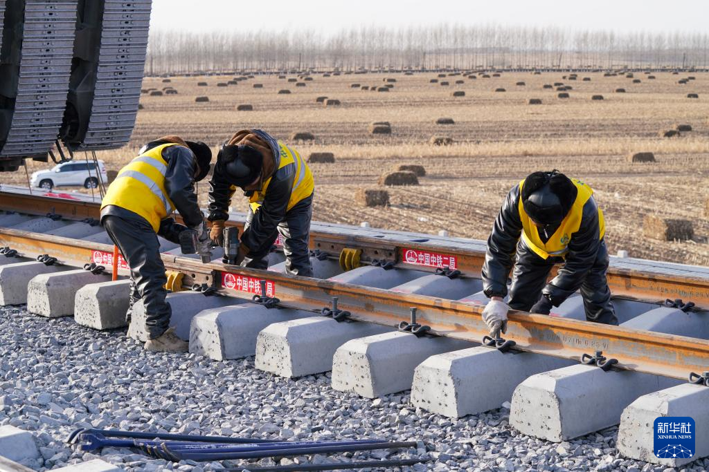 11月25日,工人在黑龙江省绥化市庆安县永华村哈伊高铁哈铁段铺轨现场工作。新华社记者 王松 摄