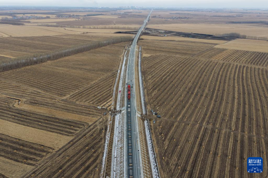 这是11月25日在黑龙江省绥化市庆安县永华村拍摄的哈伊高铁哈铁段铺轨现场(无人机照片)。新华社记者 王松 摄