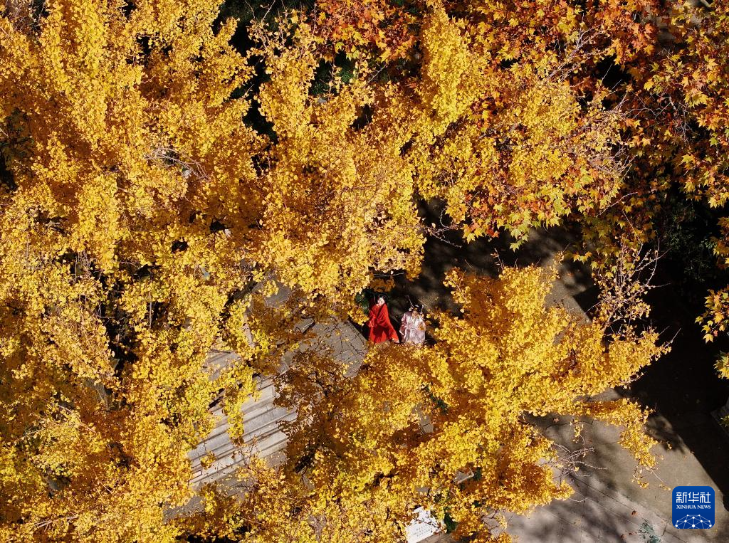 11月28日,游人在湖北省武汉市首义公园银杏树下游玩(无人机照片)。新华社发(赵军摄)